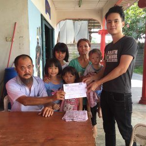 一名德士司机,但最近刚切除背部的肿瘤,每天必须到医院清洗伤口,导致接载乘客的数量每日有限,收入降低。每天都必须给RM50的德士租金,屋子也必须缴付RM650每个月租金。孙女是一名过动儿,时时刻刻都没有休息,而且心脏有孔。儿子和媳妇在去年抛下家人离家出走,不认孙女为自己的女儿,没有音讯也没给生活费了。老婆则因为家里负担重大,也要有人看顾孙女,唯有接获一些散工来做增加收入。最近家里的成员都是吃快熟面过活。其实有想过要送孙女给福利部,但真的不忍心把自己的孙女送走。