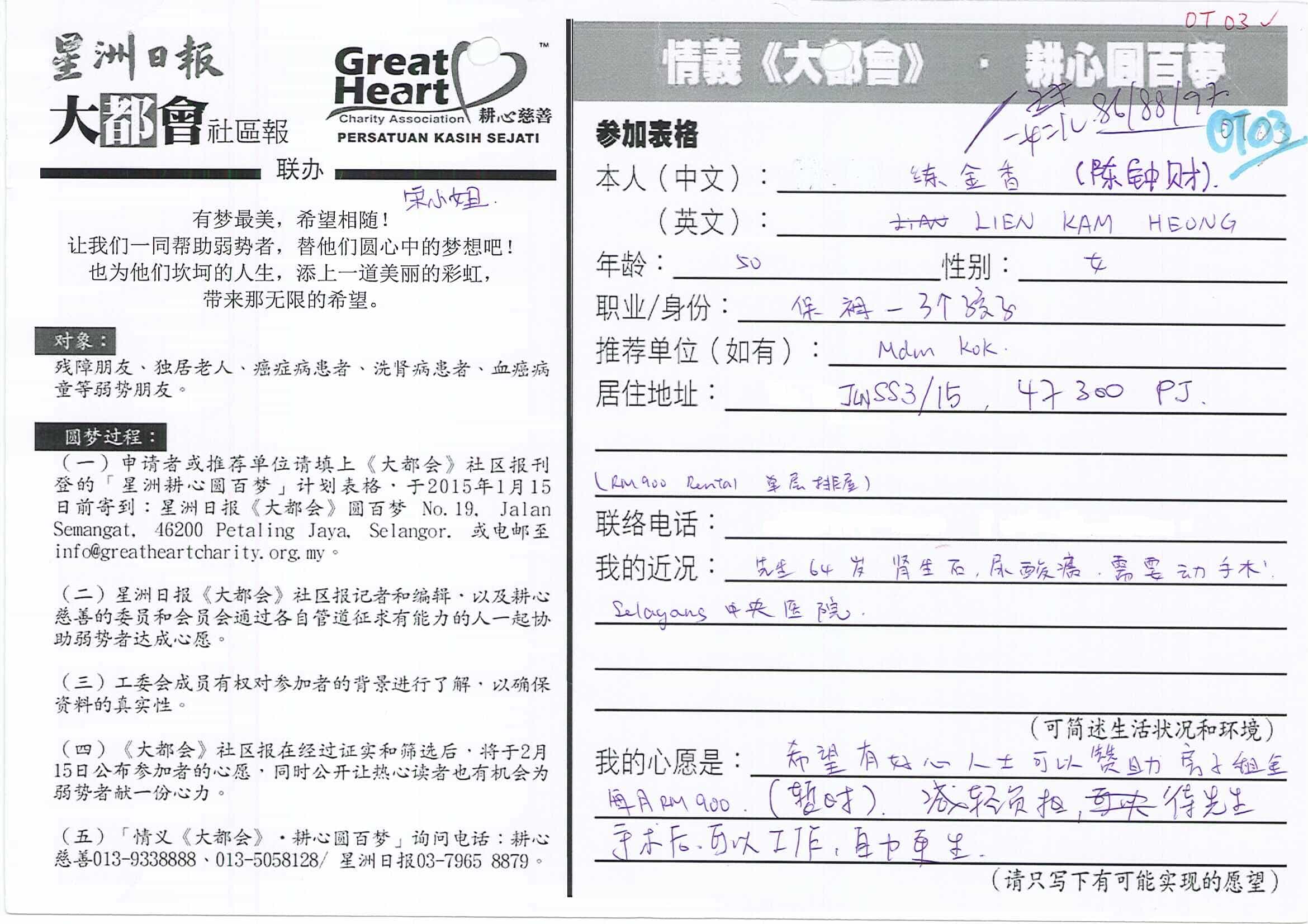 希望有心人能够赞助房子租金每个月RM 900, 解决短期内的经济负担、医好我的丈夫、好好的让我小女儿毕业,我们就可以自力更生了。